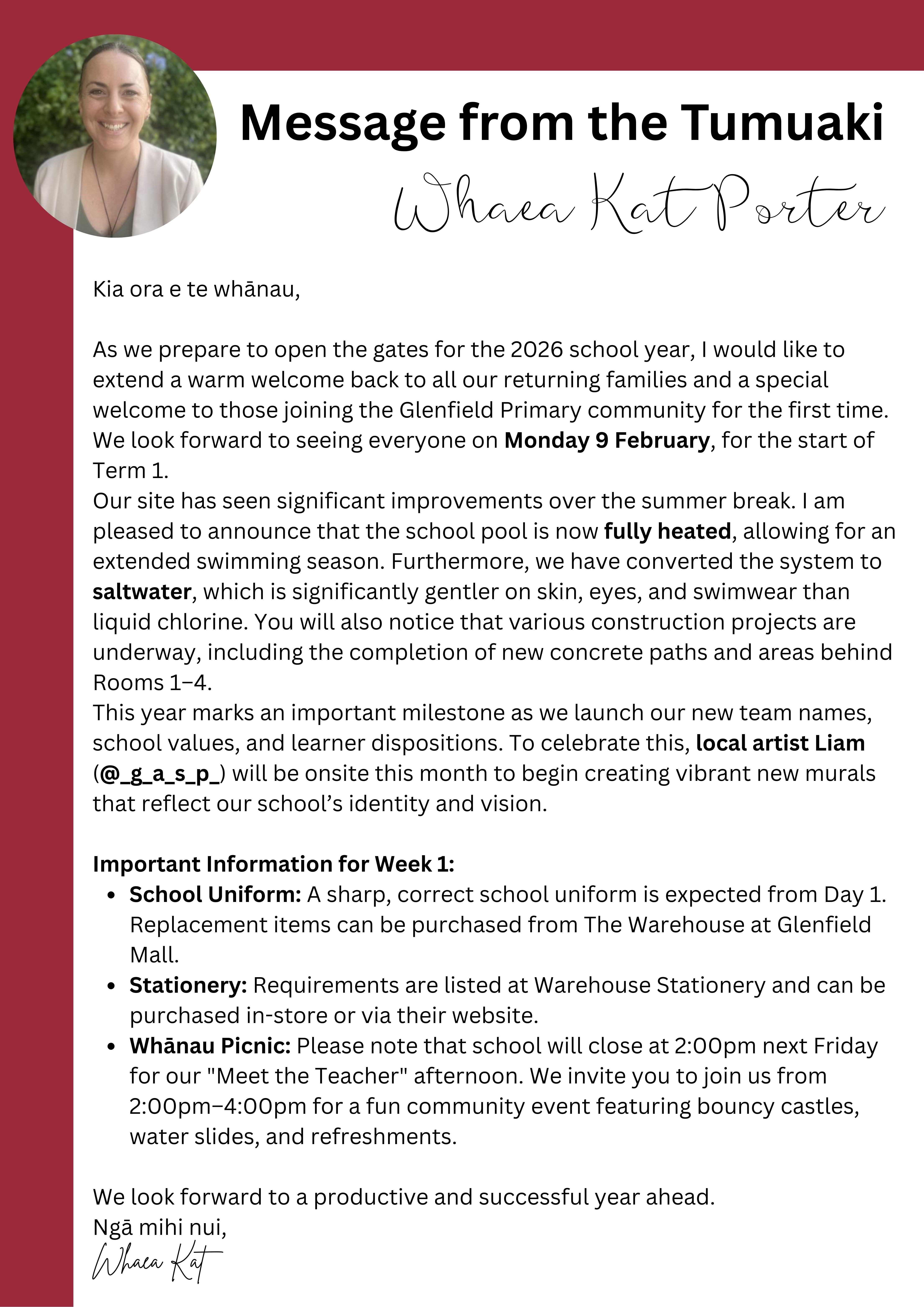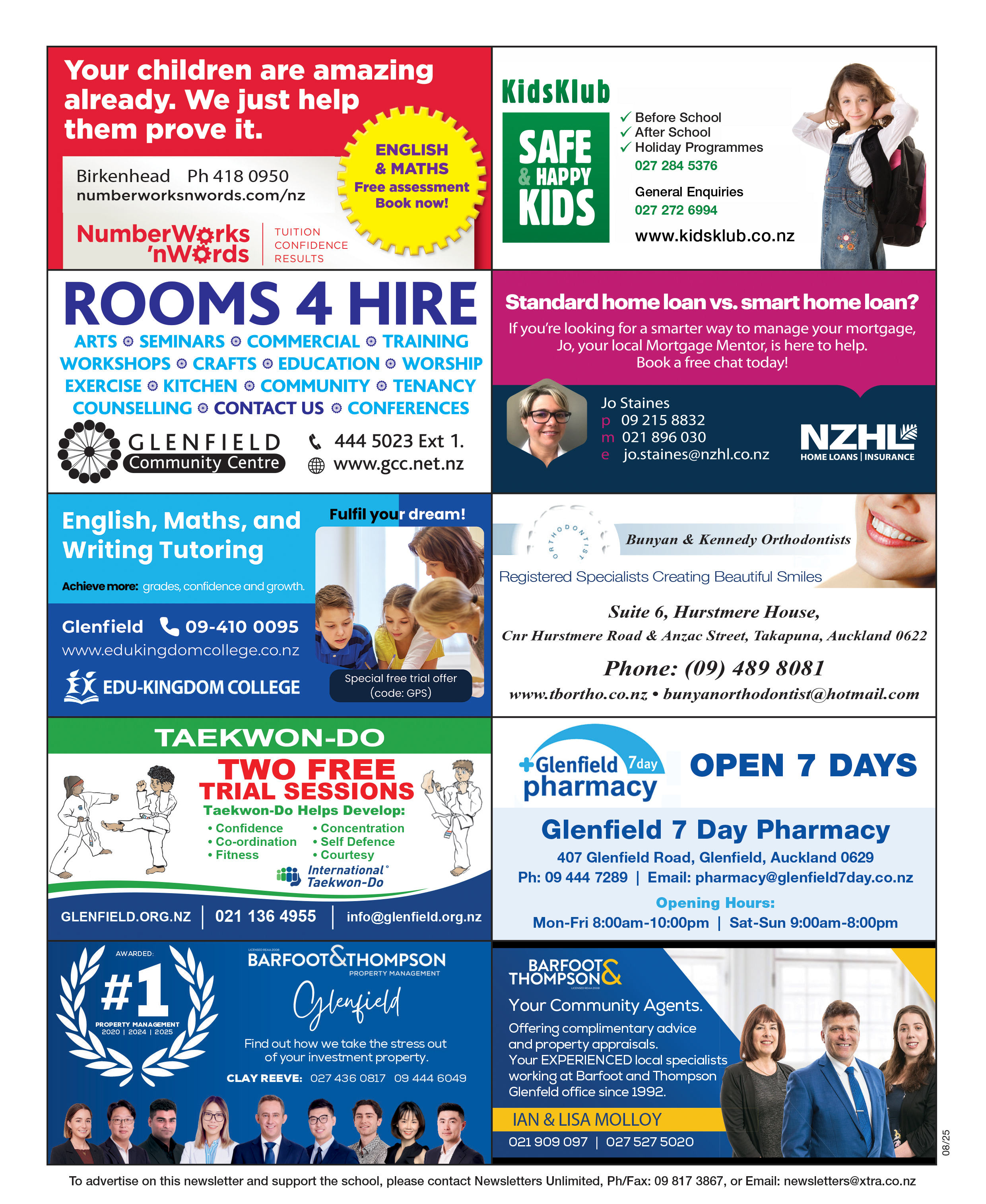 Glenfield Primary School Newsletter Family Fun Day Copyright © Glenfield Primary School 2026 Click here to unsubscribe. Powered by KiwiSchools 4.0 Call us on 09 441 8730 Email us at office@glenfield.school.nz 101 Chivalry Road Glenfield Auckland 0629