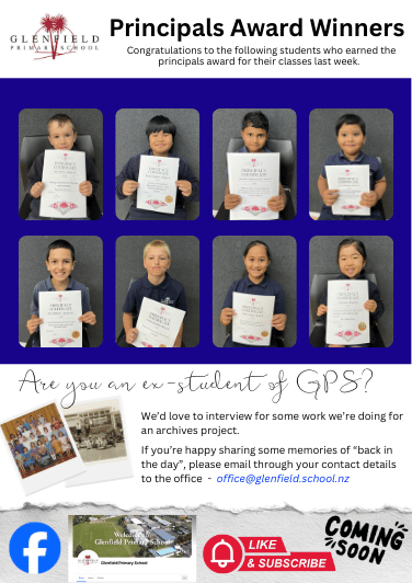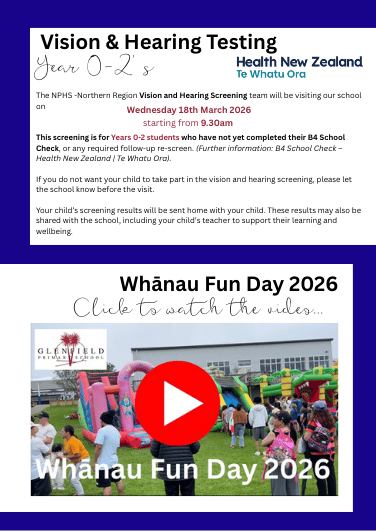 Glenfield Primary School Newsletter Family Fun Day Copyright © Glenfield Primary School 2026 Click here to unsubscribe. Powered by KiwiSchools 4.0 Call us on 09 441 8730 Email us at office@glenfield.school.nz 101 Chivalry Road Glenfield Auckland 0629