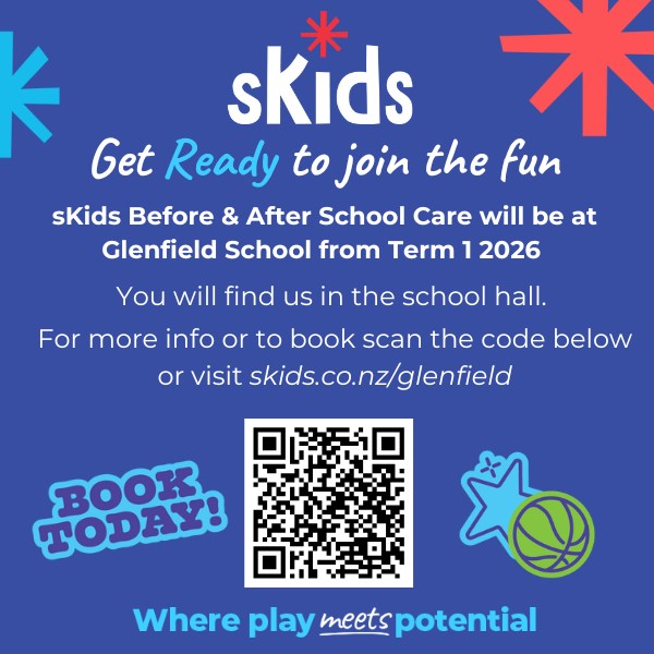 Glenfield Primary have partnered with SKIDS to offer Before School, After School, Holiday Programmes and Childcare options for our whānau. The programme is conveniently run from our school hall offering early and late pick up options to cater to all parents working needs.