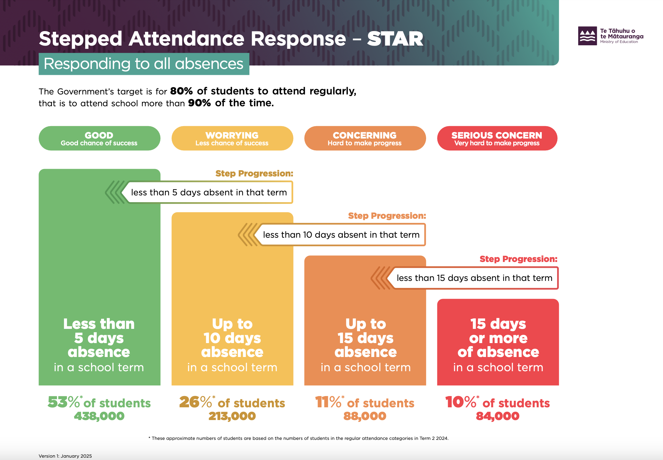 We utilise the Ministry of Education’s STAR system to monitor and respond to all absences. This plan helps us set clear expectations and provide a graduated approach if attendance begins to decline.